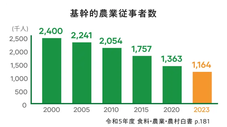 農業人口は、年間4〜8万人ほど減少。高齢化に加え、若年層の新規就農者も減っており、10年後には半分以下にまで衰退していることが予想されます。その先に待っているのは、価格の高騰や市場に野菜が出回らなくなるという深刻な問題。私たちはそうした日本の農業課題の抜本的な解決を目指し、みずから農業に参入することを決意しました。